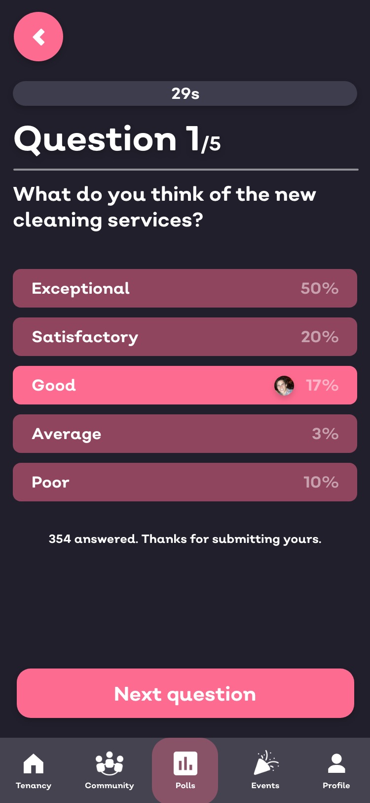 Get instant feedback from select groups of customers within your building, with easy to use surveys and polls. Send questionnaires to people within your block, company, community, or location at any given time.